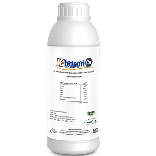 K boron Ca es un producto diseñado para el fortalecimiento físico de los órganos aéreos de las plantas y mejoramiento de la calidad. Contiene inductores de resistencia sistemática que permiten mantener activo y funcional el sistema de defensa de las plantas. Sus ingredientes (K, Ca, Cu, S, B, silicatos y polifenoles entre otros) están directamente relacionados con los factores de calidad que determinan la consistencia, color, sabor, firmeza, tamaño, dureza, y lignificación; además de mejorar la cicatrización de heridas. K boron Ca puede emplearse en cualquier etapa de desarrollo, donde se pretenda promover resistencia física a diferentes tipos de estrés, como el ambiental o por el ataque de patógenos, entre otros, además de mejorar el balance en el crecimiento en plantas sobre-vigorizadas por excesos de agua, nitrógeno y temperaturas altas, previniendo el acame en cereales.