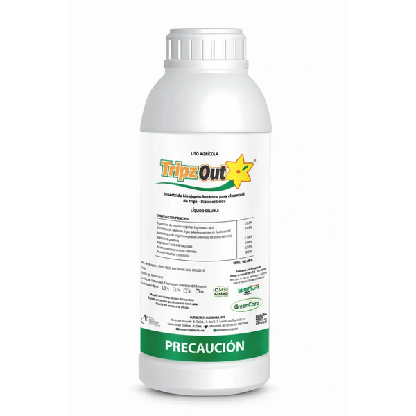 Tripz Out® es un insecticida biológico-botánico desarrollado de manera especial para el control de trips, está elaborado a partir del fermentado de dos cepas sobresalientes de Verticillium lecanii y Beauveria bassiana fortalecido con aceites vegetales de acción efectiva para el control del insecto. Tripz Out® contiene compuestos atrayentes logrando que el insecto se exponga fuera de los órganos florales o donde este se localice, y así lograr la efectividad del producto. Tripz Out® puede combinarse o rotarse con otros insecticidas químicos sintéticos o con pesticidas botánicos.